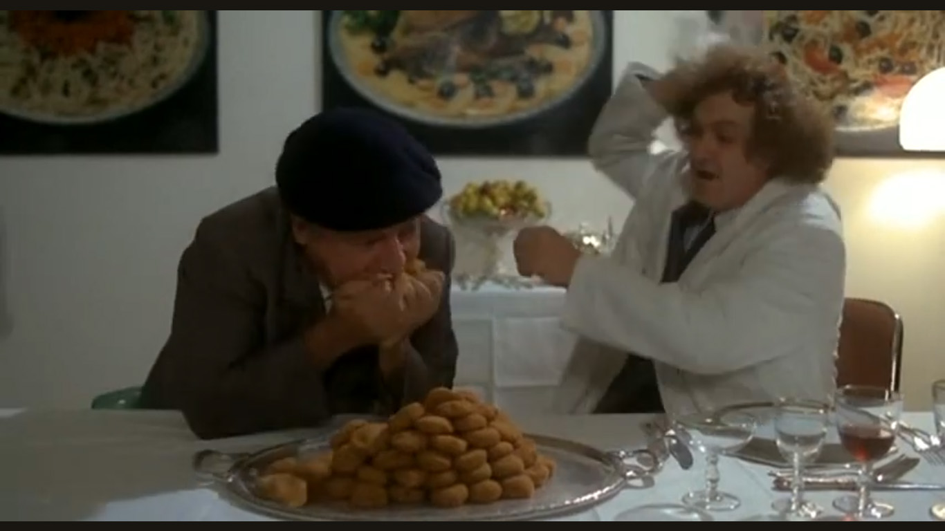 Nella scena, a destra, il Professor Birkermaier ben rappresenta il sadismo della direttrice che ti fa annusare opportunità che non ti dà. A sinistra, l’appetito furtivo di Fantozzi (e solo l’appettito furtivo) rappresenta egregiamente come la direttrice sottrae, a piccoli passi, tutto quello che può e con l’obiettivo finale di vuotare tutto quello che c’è sul piatto.