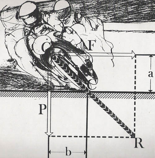 Su due ruote questa volta, lo schema evidenzia grazie ai vettori, la forza peso che spinge la moto verso il basso e la forza che la spinge la moto stessa all’esterno della curva (ovviamente i pneumatici si opporranno dando luogo ad una reazione vincolare uguale e contraria). E’ inoltre visibile il vettore a generato dalla composizione delle 2 forze: il vettore risultante. L’origine dei vettori è nel baricentro dell’insieme moto-pilota.