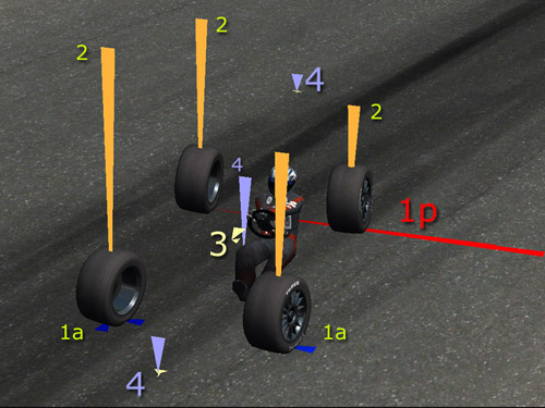 Vettori 1p in figura. L’aderenza al retrotreno è bassa, oppure il pilota ha superato il limite sopportato dalla sua vettura e dal suo setup in quella parte di telaio. Forse vi è uno squilibrio nella distribuzione delle masse tra avantreno e retrotreno o forse un problema di aderenza dovuto a campanature eccessive e quindi allo scarso contatto delle gomme a terra o ancora la taratura dei differenziali non permette una buona apertura del gas in quel punto del tracciato ed infine la molle posteriori potrebbero avere una taratura insufficiente e non assorbire le forze che agiscono sul veicolo e che, di conseguenza, sfogano totalmente sulle gomme. Se il setup è corretto, il vettore rosso alle gomme posteriori potrebbe indicarci che il pilota ha effettuato una manovra spettacolare ma che manda in crisi gomme e telaio.