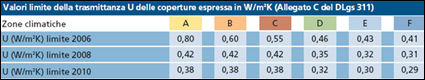 Il territorio italiano e’ stato infatti suddiviso in 7 zone climatiche, che vanno dalla zona A (in cui rientrano i Comuni piu’ caldi) alla F, (che comprende i piu’ freddi): i valori di trasmittanza diventano progressivamente piu’ bassi dalla A alla F, dove la richiesta di riscaldamento e’ maggiore e l’involucro degli edifici deve riuscire a disperdere all’esterno la minor quantita’ possibile di calore.