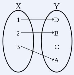 • Iniettiva, in parole povere, significa che “distinti elementi di un insieme A, hanno distinte immagini nell’insieme B“. Tuttavia l’insieme B può avere anche altri elementi che non travano corrispondenza in A.
