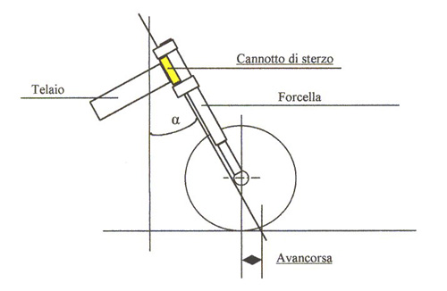 L’avancorsa è la distanza espressa in millimetri tra le proiezioni a terra della perpendicolare passante per il centro della ruota e l’asse di rotazione della forcella, questo valore sarà positivo nel caso in cui l’asse di rotazione cadrà anteriormente alla perpendicolare della ruota, altrimenti il valore sarà negativo.